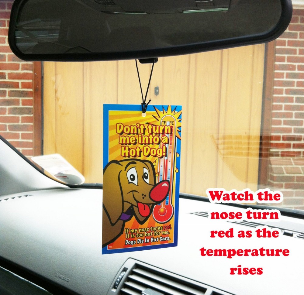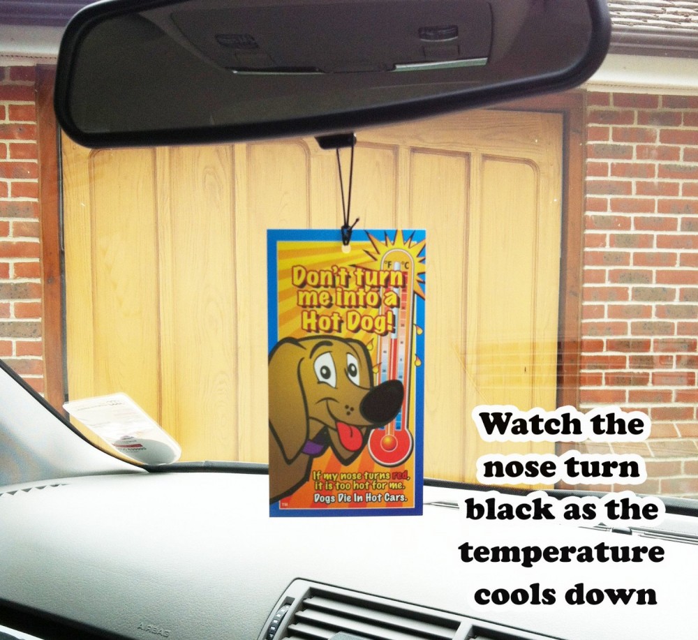 DON'T LET YOUR PETS BECOME A STATISTIC! Knowledge is power! Produced in the UK for and used by various Pet Health organisations including the Canine Health Foundation in the US. The Hot Dog Alert Tag is here to help! Leave the tag hanging from your rear view mirror. When the temperature inside the car gets hot the dog's nose will become red. This indicates that no pet should be left inside the car REGARDLESS of whether or not a window remains somewhat open! This is not a substitute for owners common sense!